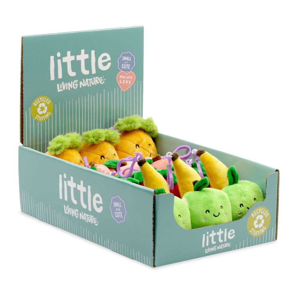 Get ready for a cuteness overload with our Little Living Nature wholesale fruit plush keyring clips. Perfect for adding a touch of fun to a bag or set of keys these plush keyring clips will make an irresistible impulse addition to your stores. Affordable, adorable and collectable we've created the ultimate impulse purchase toy. Our Fruit Little Living Nature wholesale keyring collection features the cutest Little Living Nature fruit including peach, watermelon, apple, banana, pineapple and strawberry - pick your favourite or collect them all! Our wholesale fruit Little toys will arrive in a thoughtfully designed FREE merchandising counter display box, unwrap and pop them straight onto your POS. To protect the animals we love, we need to protect the places they live too, so we're making our toys more sustainable by using recycled materials. We use plastic bottles and containers that might otherwise end up in landfills or our oceans and give them a new lease of life as stuffing in our toys. It’s so incredibly soft that you would never guess it was made from plastic! Perfect for cuddles and playtime adventures!